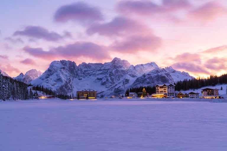 Colorful sky at sunset due to foehn (Favonio) wind over Misurina and Sorapis mountain covered with snow, Dolomites, Veneto, Italy